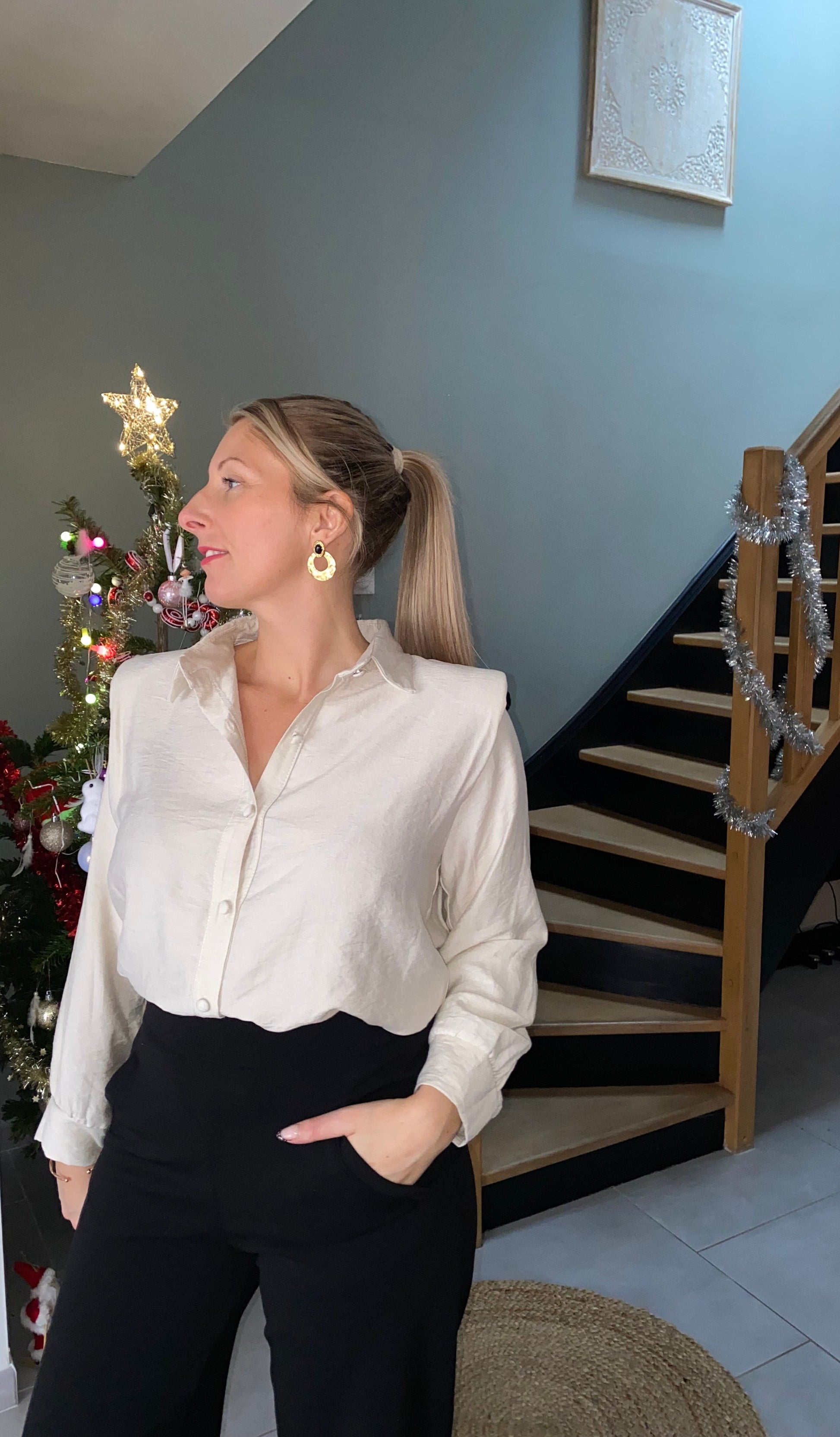 Jolie Chemise élégante à boutons et aux épaules structurées, manches longues.