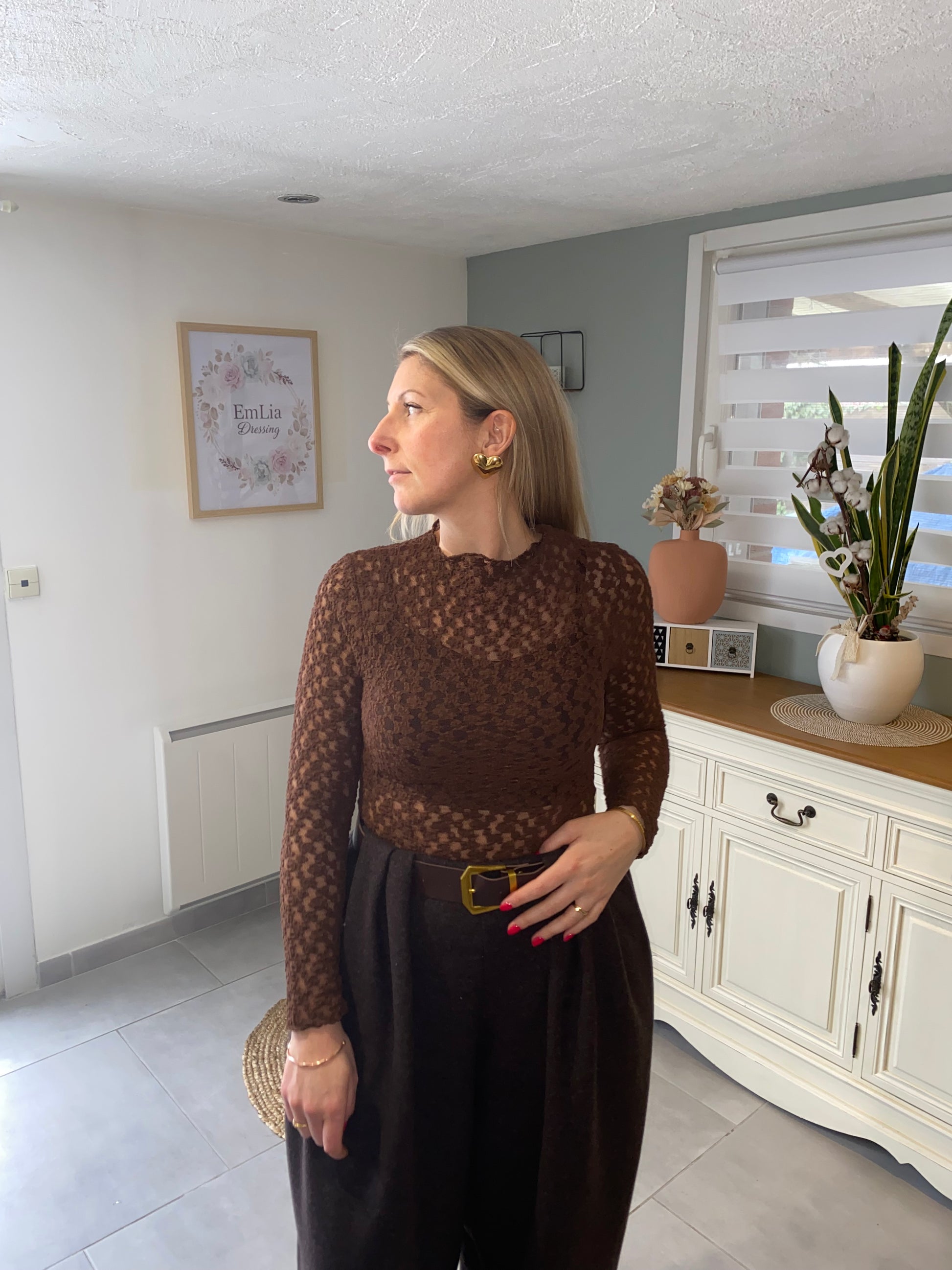 Ce top en dentelle délicate présente une coupe ajustée, des manches longues et un col rond. Son design léger et aéré, sans doublure, en fait une pièce élégante et féminine, idéale pour des occasions variées.